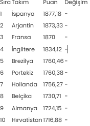 İspanya'nın 2025 yılını zirvede tamamladığı FIFA dünya klasmanında ilk 10 sıradaki ülkelerin yeri değişmedi.