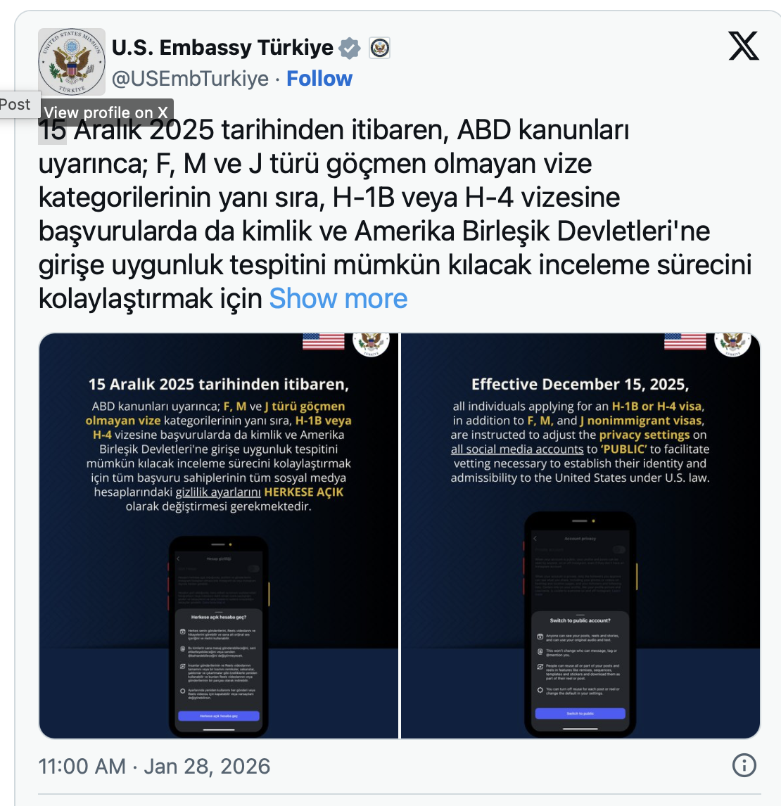 ABD'nin Türkiye Büyükelçiliği, F, M ve J türü göçmen olmayan vize kategorilerinin yanı sıra H-1B ve H-4 vizesine başvuranların sosyal medya hesaplarının gizlilik ayarlarının "herkese açık" olarak değiştirilmesi gerektiğini açıkladı. Büyükelçiliğin sosyal medya hesabından yapılan açıklamada, bu uygulamanın 15 Aralık 2025 tarihinden itibaren geçerli olduğu belirtildi.