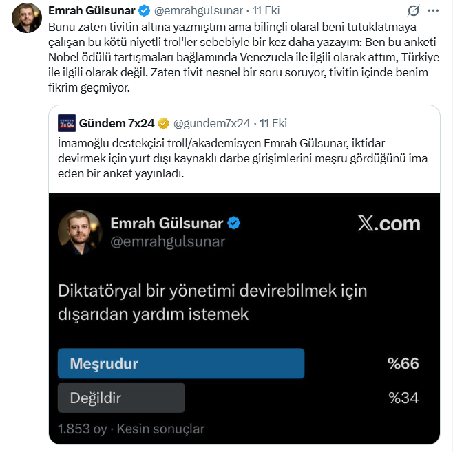 “Bu anketi Nobel ödülü tartışmaları bağlamında Venezuela ile ilgili olarak attım, Türkiye ile ilgili olarak değil. Zaten tweet nesnel bir soru soruyor; içinde benim fikrim geçmiyor.”