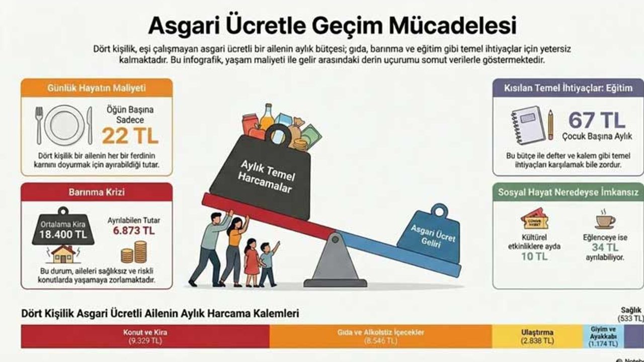 "Asgari Ücretle Geçim Araştırması" başlığıyla yayımlanan rapora göre, eşi çalışmayan ve iki çocuklu bir asgari ücretli, şubat ayında eline geçecek olan 28 bin 75 TL’lik ücretle gıdaya günlük sadece 267 lira ayırabilecek. Bu miktar, dört kişilik bir ailenin üç öğün beslenmesi için kişi başına 89 TL, öğün başına ise sadece 22 TL düşmesi anlamına geliyor.