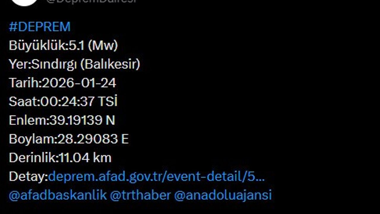 AFAD'ın paylaştığı bilgilere göre, Balıkesir'in Sındırgı ilçesinde saat 00.24'te 5.1 büyüklüğünde deprem meydana geldi. Depremin derinliği ise 11.04 kilometre olarak kaydedildi.