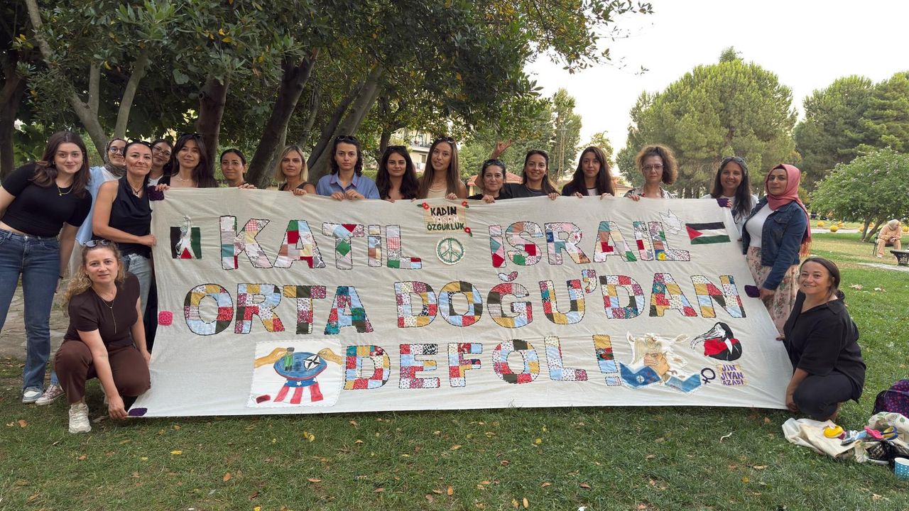 Gazze’de ve Ortadoğu’da süren işgal, katliam ve yıkıma karşı kadınlar, atölyede hazırladıkları büyük pankartta seslerini kolektif üretimle duyurdu. Üzerinde “İsrail Ortadoğu’dan defol” yazan pankartla, emperyalizmin ve savaş çığırtkanlığının karşısında barışın, emeğin ve kadın dayanışmasının sesi olmayı hedeflediler..