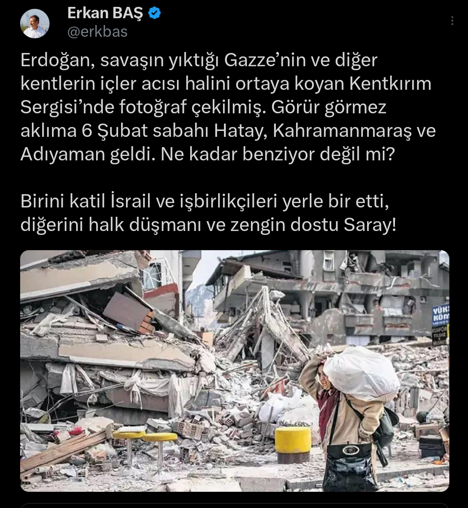 Erkan Baş, sosyal medya hesabından yaptığı paylaşımda, "Erdoğan, savaşın yıktığı Gazze’nin ve diğer kentlerin içler acısı halini ortaya koyan Kentkırım Sergisi’nde fotoğraf çekilmiş. Görür görmez aklıma 6 Şubat sabahı Hatay, Kahramanmaraş ve Adıyaman geldi. Ne kadar benziyor değil mi? Birini katil İsrail ve işbirlikçileri yerle bir etti, diğerini halk düşmanı ve zengin dostu Saray!" ifadesini kullandı.