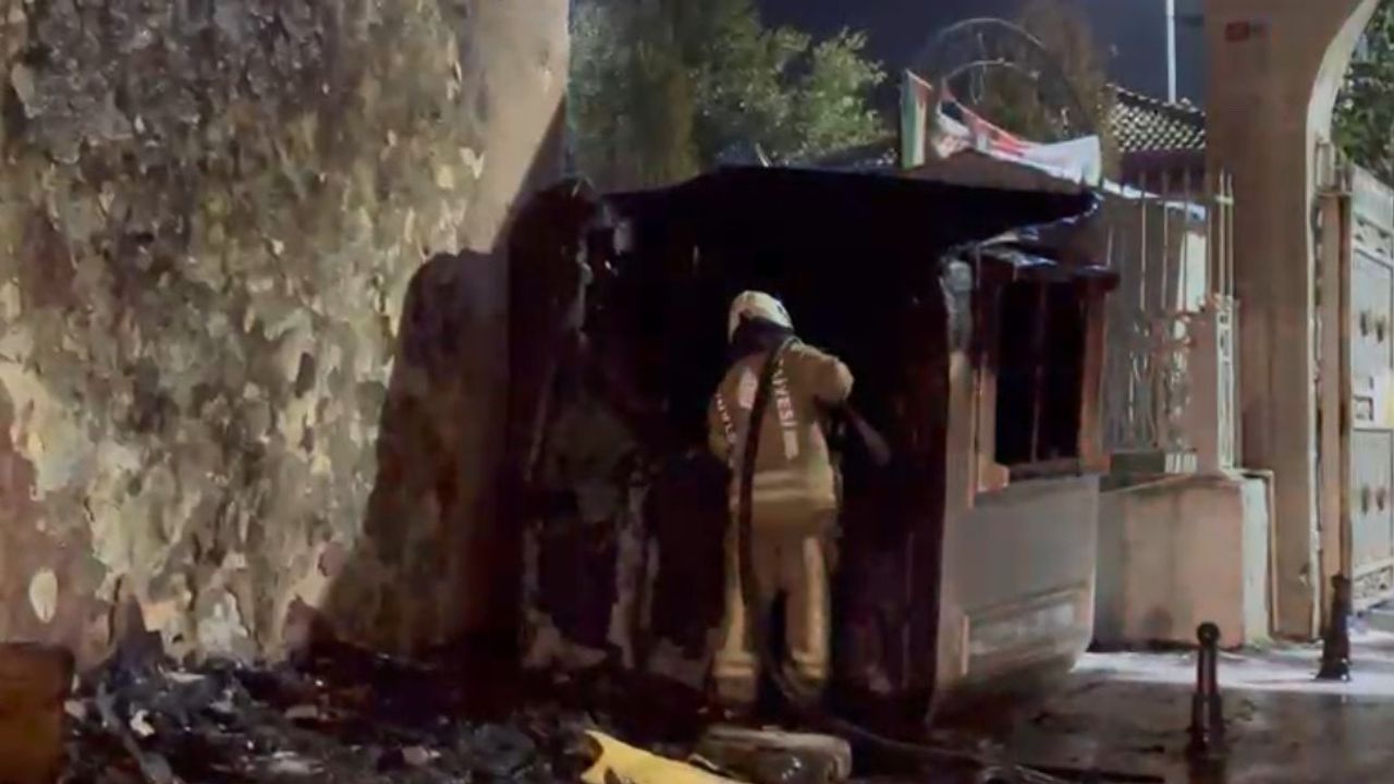 İstanbul Fatih'te cami dışındaki güvenlik kulübesi alev alev yandı.