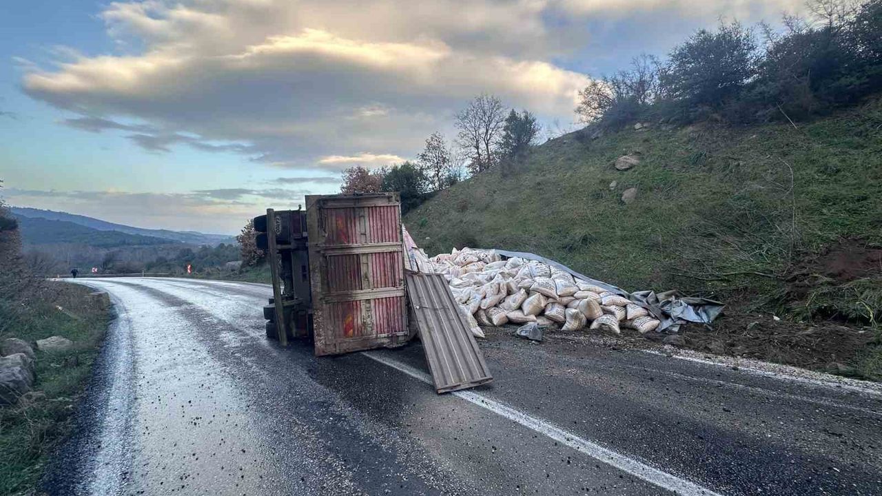 Edinilen bilgiye göre, Gönen-Denizkent yolu Ulukır mevkiinde sabah saatlerinde bir trafik kazası meydana geldi. Seyir halindeki 16 SR plakalı yem yüklü kamyon, sürücüsünün direksiyon hakimiyetini kaybetmesi sonucu devrildi. Kazada yaralanan olmazken, araçta maddi hasar oluştu.