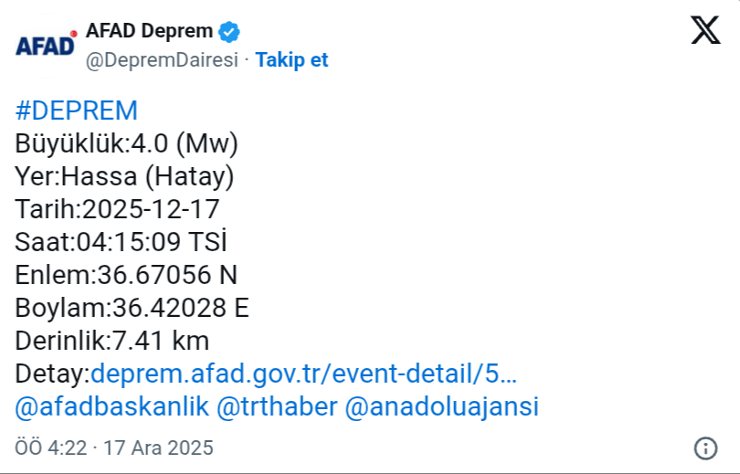 Hatay'ın Hassa ilçesinde saat 04:15'te 4.0 büyüklüğünde deprem meydana geldi.