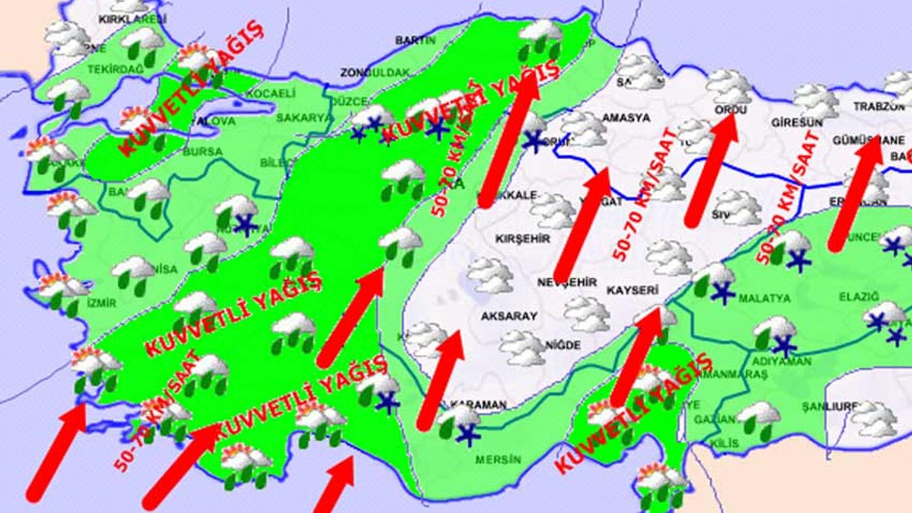 KUVVETLİ RÜZGAR UYARISI: Rüzgarın; Marmara, Ege, Akdeniz, İç Anadolu’nun güney ve doğusu, Orta ve Doğu Karadeniz’in iç kesimleri ile Doğu Anadolu'nun kuzey ve batısında güneyli yönlerden zamanla Marmara'nın batısında kuzeyli yönlerden kuvvetli ve yer yer fırtına (50-80 km/saat) şeklinde esmesi beklendiğinden ağaç ve direk devrilmesi, çatı uçması, soba ve doğalgaz kaynaklı baca gazı zehirlenme riski ile ulaşımda aksamalar gibi olumsuzluklara karşı dikkatli ve tedbirli olunması gerekmektedir.