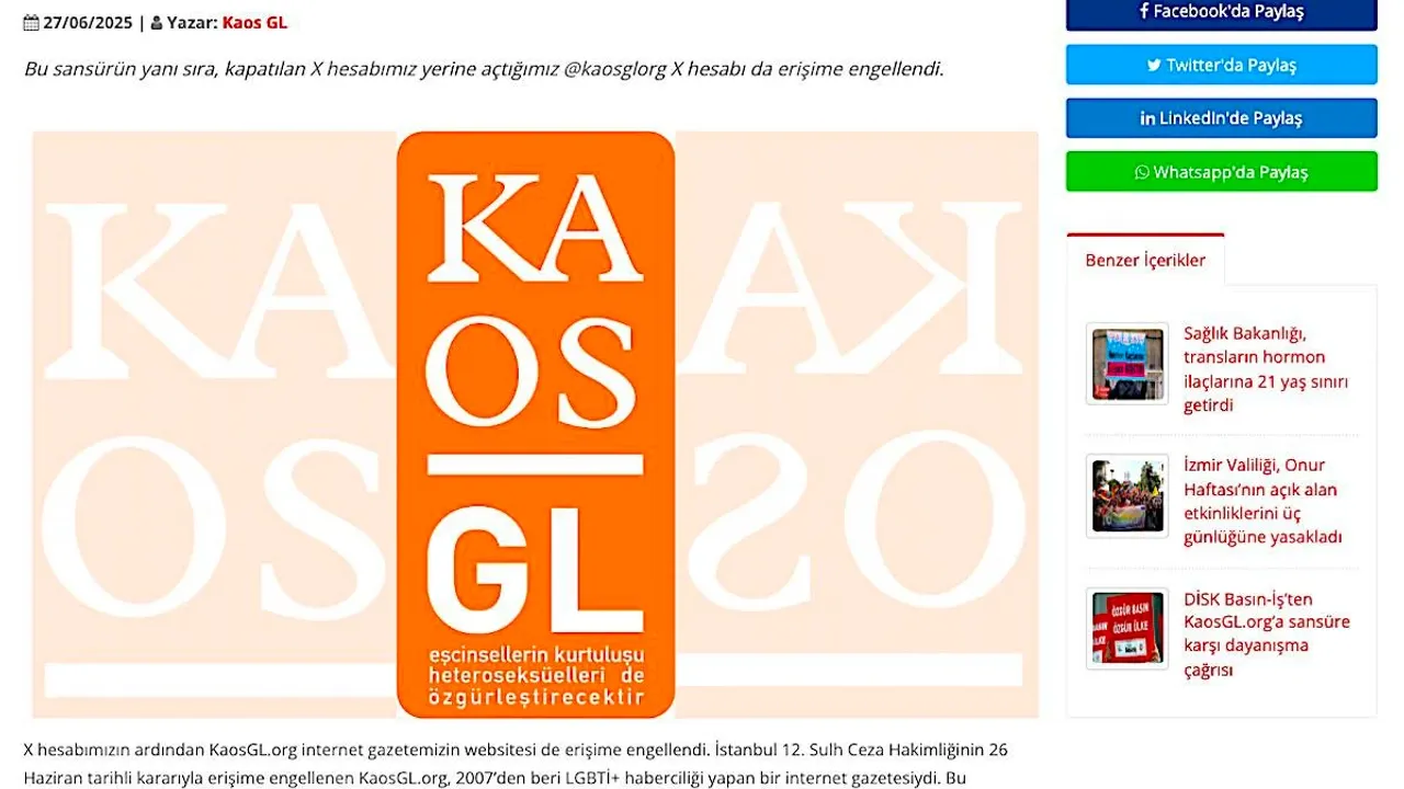 Hafta başında LGBTİ+'lerin en etkili yayınlarından KaosGL'nin sosyal medya hesabı bir Sulh Ceza Hakimliği kararıyla erişime engellenmişti. Ardından KaosGL.org internet gazetesinin websitesi KaosGL.org, da İstanbul 12. Sulh Ceza Hakimliğinin 26 Haziran tarihli kararıyla erişime engellendi.