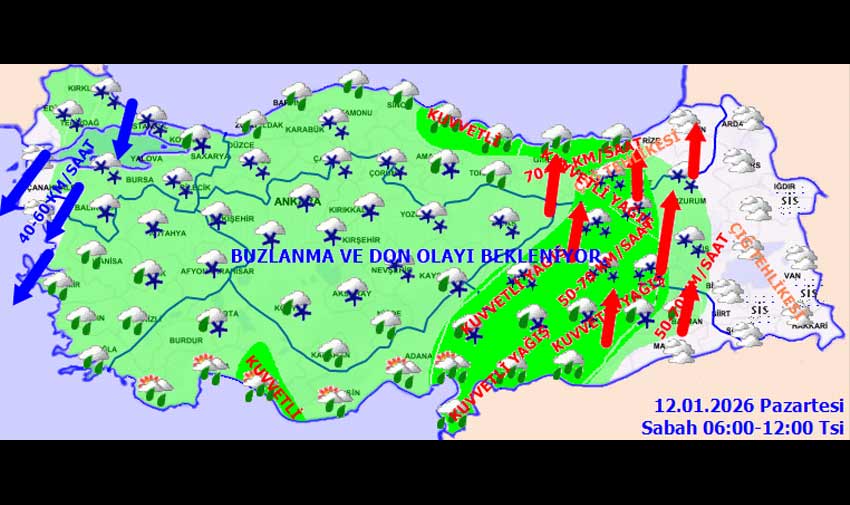 KUVVETLİ RÜZGAR UYARISI: Rüzgarın; Marmara ile Kuzey Ege kıyılarında kuzey ve kuzeydoğu, Doğu ve Güneydoğu Anadolu'da güney yönlerden kuvvetli ve kısa süreli fırtına (40-70 km/saat), Doğu Karadeniz’in iç kesimlerinde güney yönlerden kuvvetli fırtına (70-90 km/saat) şeklinde esmesi şeklinde esmesi beklendiğinden ağaç ve direk devrilmesi, çatı uçması, soba ve doğalgaz kaynaklı baca gazı zehirlenme riski ile ulaşımda aksamalar gibi olumsuzluklara karşı dikkatli ve tedbirli olunması gerekmektedir.