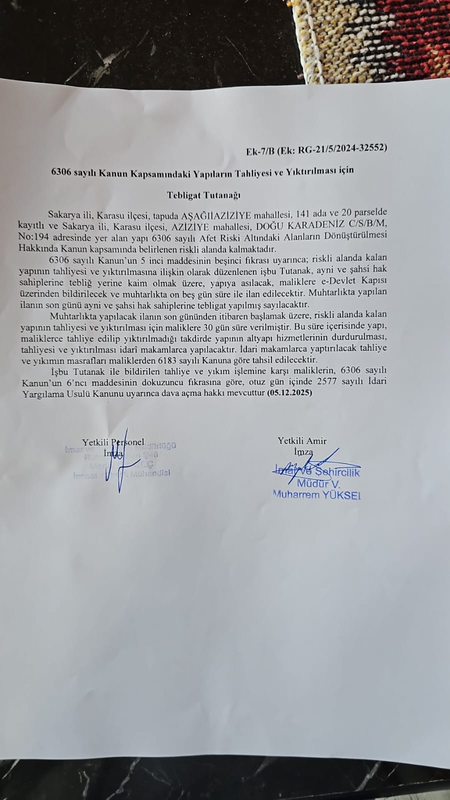 Sakarya’nın Karasu ilçesinde, 6306 sayılı Afet Riski Altındaki Alanların Dönüştürülmesi Hakkında Kanun kapsamında riskli alanda kalan yapılara yönelik tahliye ve yıkım süreci başlatıldı. Aşağıaziziye Mahallesi 141 ada 20 parselde, Aziziye Mahallesi Doğu Karadeniz Caddesi No: 194 adresindeki yapıya ilişkin tebligatın duyurulmasıyla birlikte yurttaşların mağduriyeti gündeme geldi.
