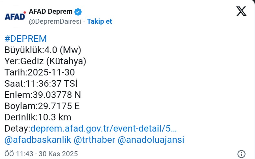 Afet ve Acil Durum Yönetimi Başkanlığının (AFAD) internet sitesinde yer alan bilgiye göre, merkez üssü Kütahya'nın Gediz ilçesi ilçesi olan 4.0 büyüklüğünde sarsıntı kaydedildi.