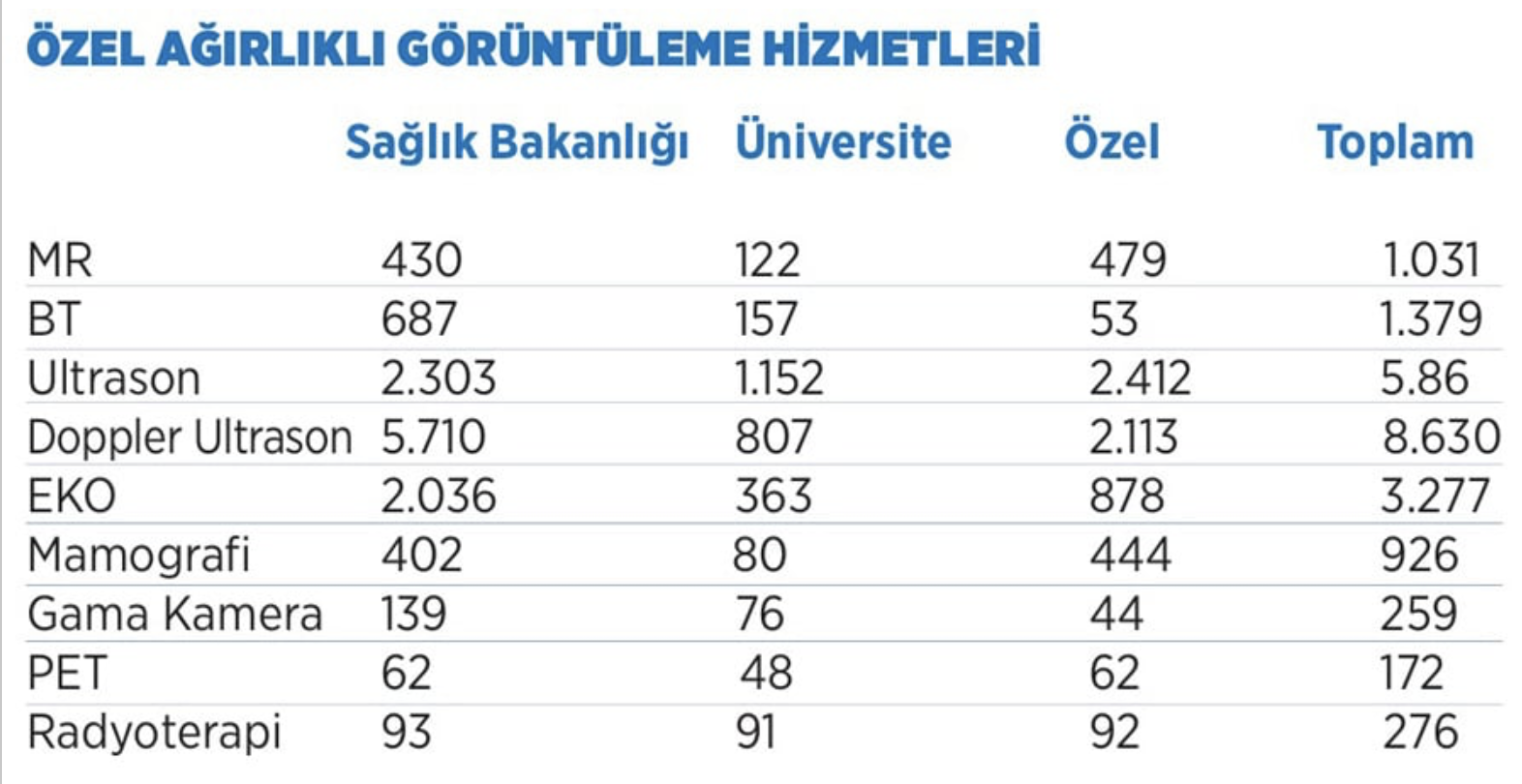 Sağlık Bakanlığı 2024 İstatistik Yıllığı Haber Bülteni’ne göre de, hastanelerde MR, BT, ultrason, Doppler ultrason ve EKO cihaz sayıları bir önceki yıla göre arttı.