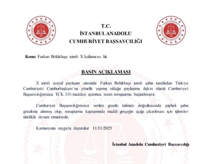 “X isimli sosyal paylaşım sitesinde Furkan Bölükbaşı isimli şahıs tarafından Türkiye Cumhuriyeti Cumhurbaşkanı’na yönelik yapmış olduğu paylaşıma ilişkin olarak Cumhuriyet Başsavcılığımızca TCK 310 maddesi uyarınca resen soruşturma başlatılmıştır. Cumhuriyet Başsavcılığımızca verilen gözaltı talimatı doğrultusunda şüpheli şahıs gözaltına alınmış olup, soruşturma kapsamında maddi gerçeğin açığa çıkarılması için işlemler titizlikle devam etmektedir.”