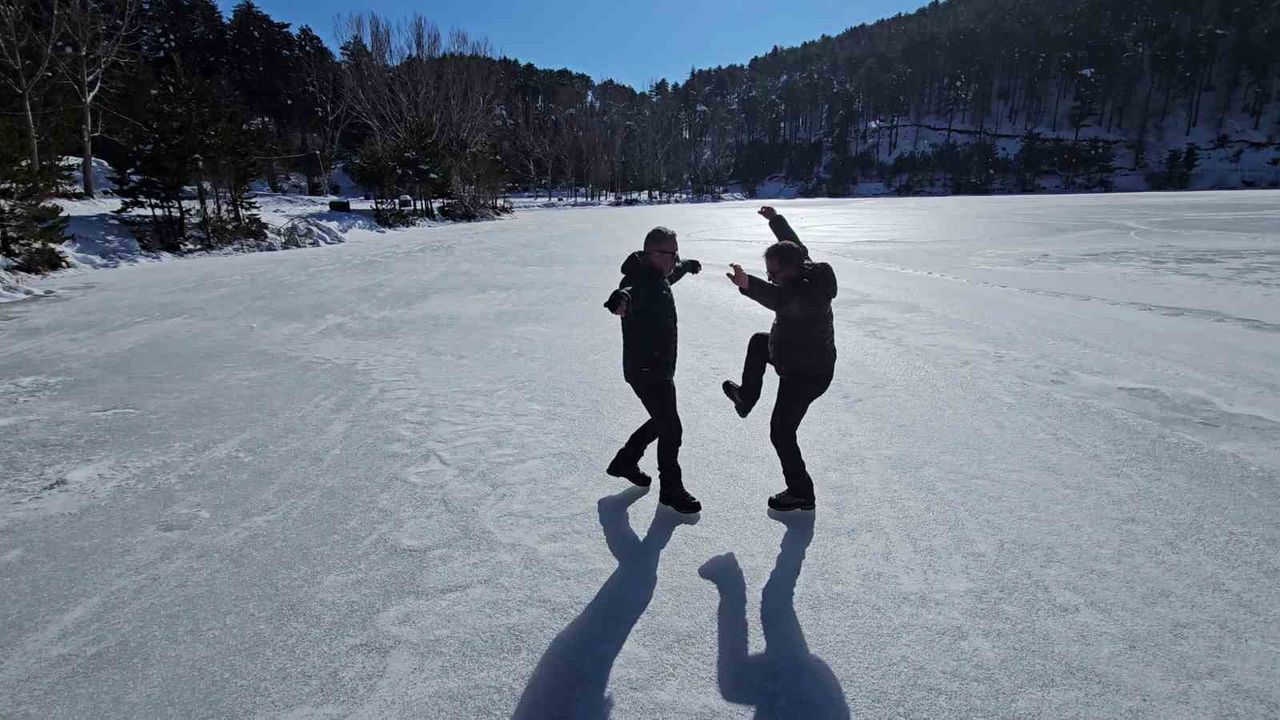 Bursa'nın doğa sporlarıyla özdeşleşen isimlerinden İsmet Şentürk, tam 6 yıldır kış aylarında Uludağ'ın buz tutan göllerine girerek herkesi şaşırtan bir geleneği sürdürüyor. Şentürk, bu yılda önce çökertme oynadığı gölün üzerini kaplayan kalın buz tabakasını kesip açtığı alandan buz gibi suya girdi.